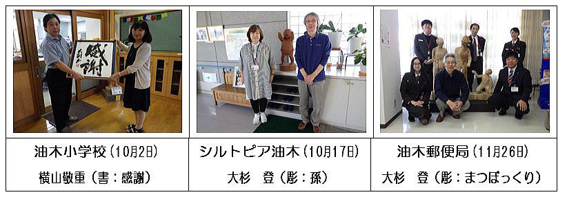 油木地域の芸術文化を一目見ようと、会期中は約100名の方が来場され、最終日は「横山大剛」先生の「色紙揮毫」も行われました。また、今回の作品展には故大杉登先生が製作された「氷上の舞」という彫塑作品が出品され、作品展終了後は神石高原中学校へ贈呈されました。